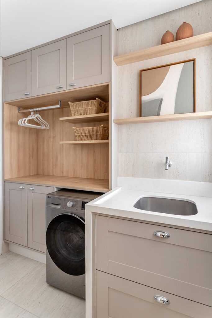 A lavanderia segue o mesmo padrão de marcenaria do restante do apartamento, mantendo os puxadores côncavos e a paleta que transita do cinza à marcenaria clara. Armários, prateleiras e cabideiro foram pensados para otimizar a rotina, mantendo o visual alinhado ao restante do projeto.