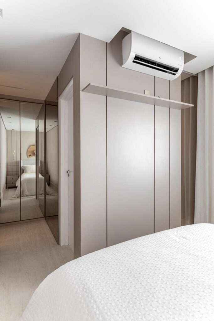 Na suíte master, a marcenaria reveste a parede e se estende para um mini closet, todo em tons de cinza, trazendo elegância e organização. No banheiro da suíte, a marcenaria aparece no armário da cuba dupla, novamente com puxadores côncavos, reforçando a identidade visual do projeto.