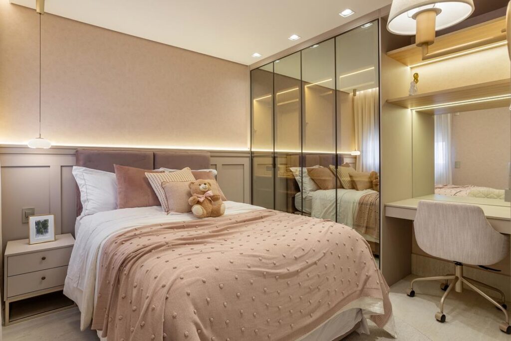No outro quarto de menina, a marcenaria também é protagonista, com guarda-roupa de portas de vidro e uma área dedicada aos estudos e à maquiagem, pensada para acompanhar a rotina e as necessidades da moradora mirim.
