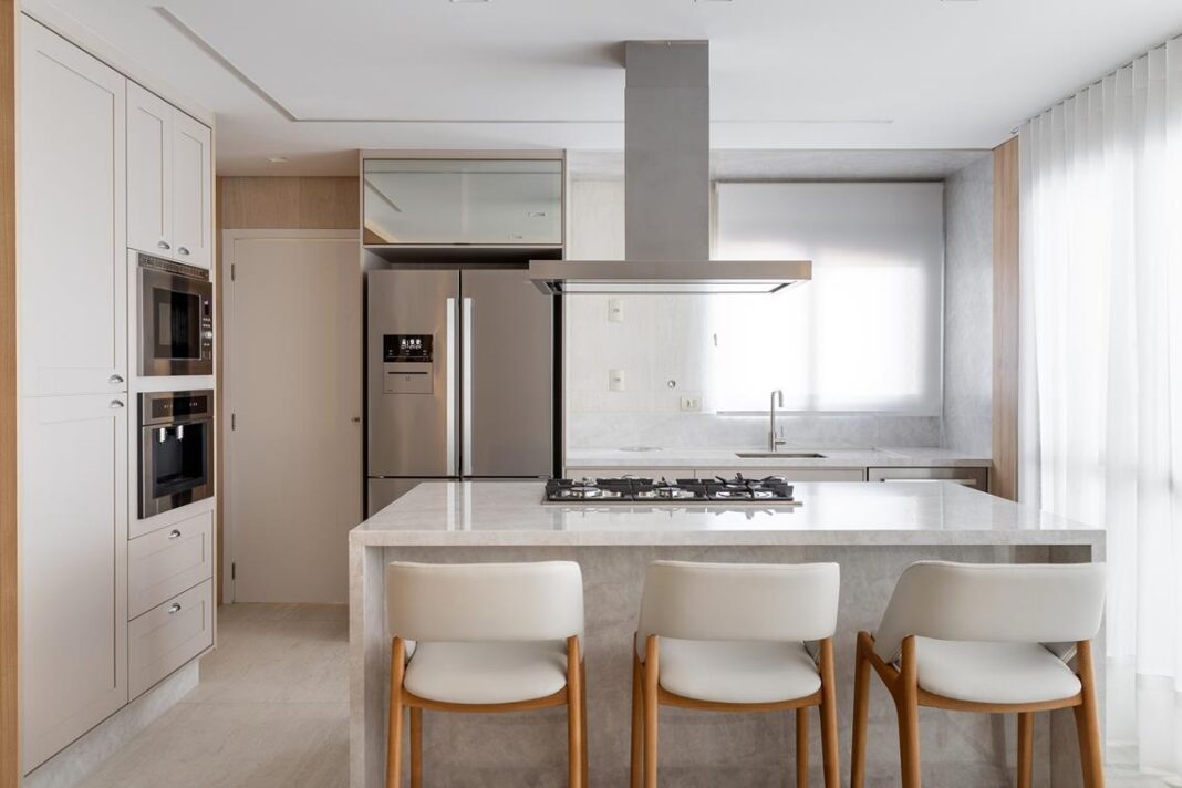 Na cozinha, a marcenaria em tom cinza se destaca pelo desenho limpo e funcional. Os puxadores côncavos, presentes em portas, gavetas e gavetões, garantem praticidade no uso diário e reforçam o visual contemporâneo. As gavetas com divisores internos otimizam a organização, enquanto os eletrodomésticos em inox trazem modernidade ao ambiente. As banquetas brancas dialogam harmoniosamente com o sofá de couro branco da sala de estar, criando uma composição leve e sofisticada.