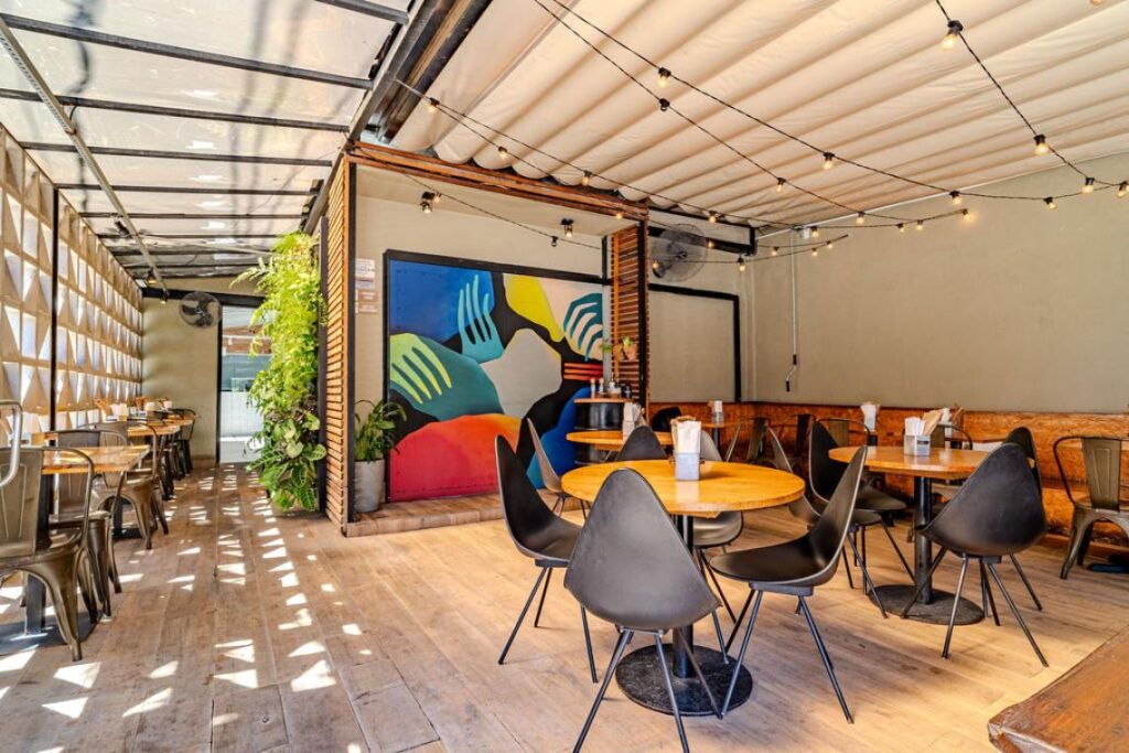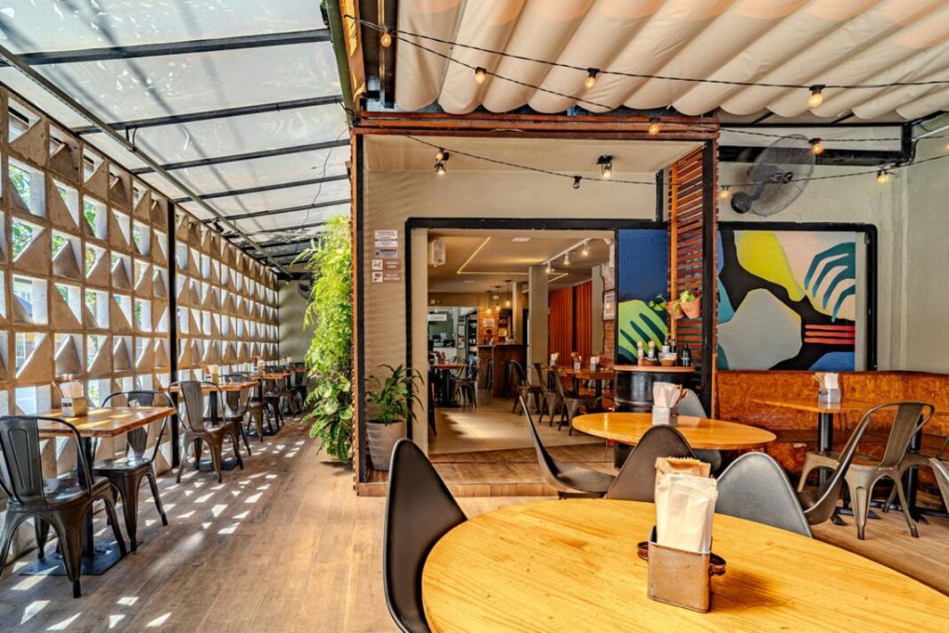 Em 200m², o projeto preserva o sistema construtivo original, incorpora elementos industriais e cria um ambiente iluminado e acolhedor que conecta arquitetura, natureza e alimentação saudável