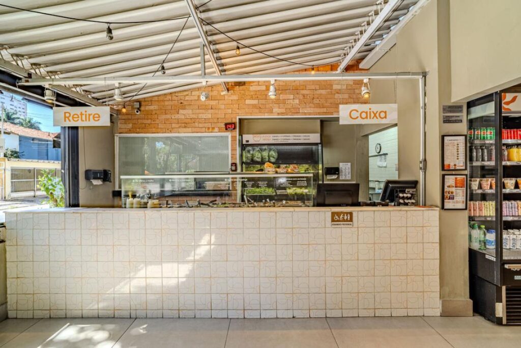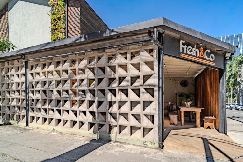 Conhecido por valorizar materiais naturais e soluções que priorizam conforto ambiental, Marcos parte da essência do Fresh&Co., comida saudável e descomplicada, para conceber um ambiente leve, iluminado e acolhedor. A iluminação e ventilação natural são protagonistas do projeto. A luz do dia percorre os salões e ressalta texturas, enquanto as aberturas garantem circulação de ar e conforto térmico.