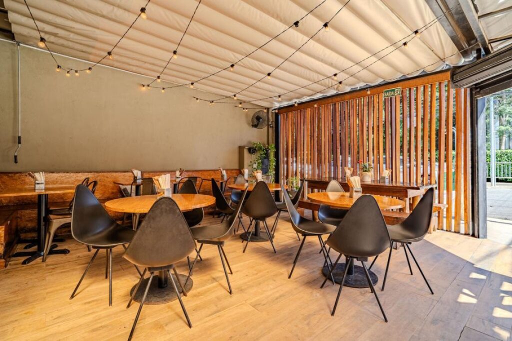 O salão principal, com cadeiras pretas e mesas de madeira, ganha um canto alemão que favorece encontros e permanência. A iluminação com varal de lâmpadas cria um clima descontraído no período noturno, equilibrando funcionalidade e charme.