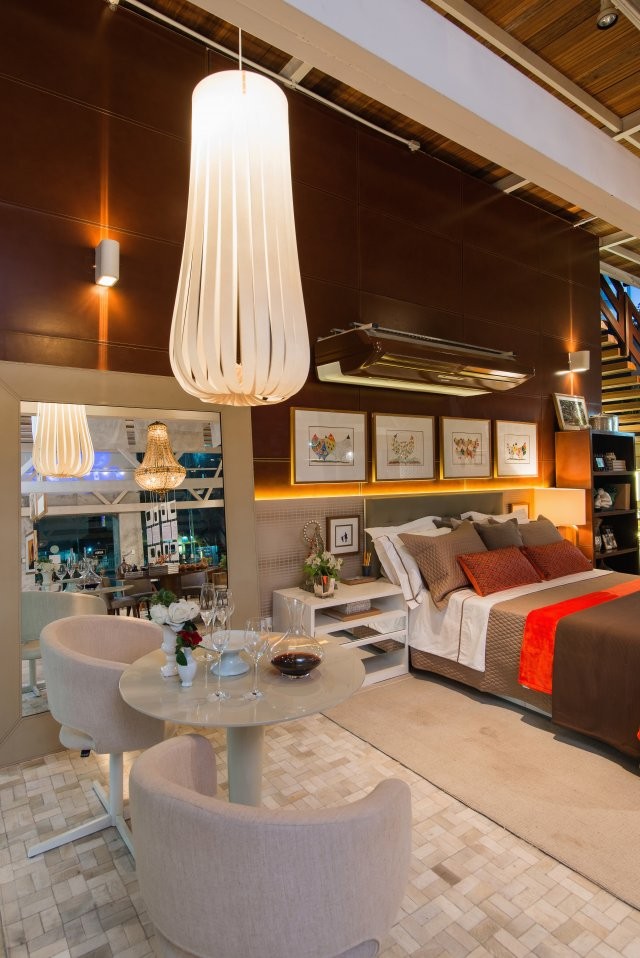 O grande painel em couro existente no espaço inspirou a predominância dos tons terrosos no ambiente, que, inteligentemente, foi iluminado com a inserção das cores bege e nude, proporcionando uma atmosfera de tranquilidade e relaxamento. Porém, como reflexo da alma dos grandes artistas, o ambiente precisava de um pouco de ousadia, e ela veio com a introdução da cor coral na roupa de cama da Exclusivité Trousseau e obras de arte assinadas pelo renomado artista plástico Leonel Mattos, deixando o espaço estiloso e vibrante.