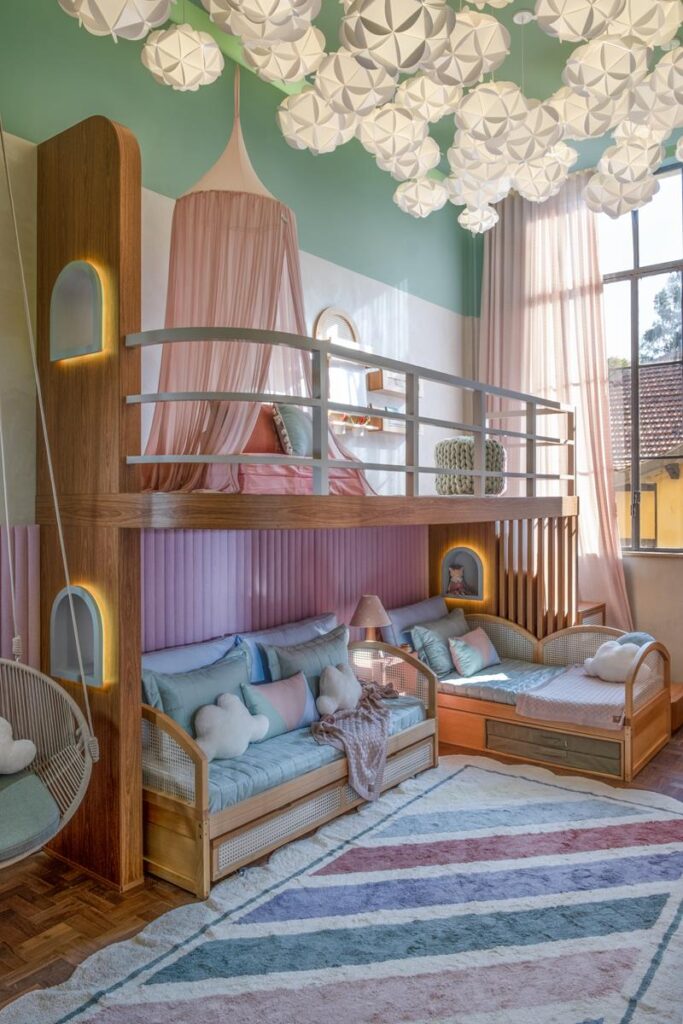 Trata-se de um projeto completo em arquitetura sensível e funcional: o ambiente contempla áreas para dormir, estudar, brincar, relaxar e receber amigos, tudo dentro do mesmo espaço, de forma integrada. A cadeira suspensa trançada, por exemplo, é ao mesmo tempo divertida e relaxante, reforçando a ideia de flutuar. Já o cantinho da leitura com dossel rosa e almofadas verdes cria um abrigo simbólico, de onde é possível se desligar do mundo e voltar ao essencial.