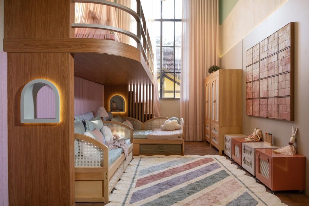 O projeto valoriza peças versáteis, que acompanham o crescimento das crianças sem abrir mão da estética. A curadoria do mobiliário foi realizada por Marta Martins em parceria com a Muskinha, marca reconhecida por seu design afetivo e funcional para quartos infantis. As peças escolhidas valorizam a versatilidade e acompanham o crescimento das crianças sem abrir mão da estética. “O design desse quarto foi pensado para crescer junto com as meninas, combinando peças versáteis como a escrivaninha dois em um, que funciona como espaço de estudo e penteadeira. Marta também trouxe elementos lúdicos, como o tapete arco-íris de algodão e luminárias em formato de nuvem, criando um ambiente leve, encantador e cheio de personalidade”, afirma Amanda Chatah, sócia idealizadora da Muskinha.