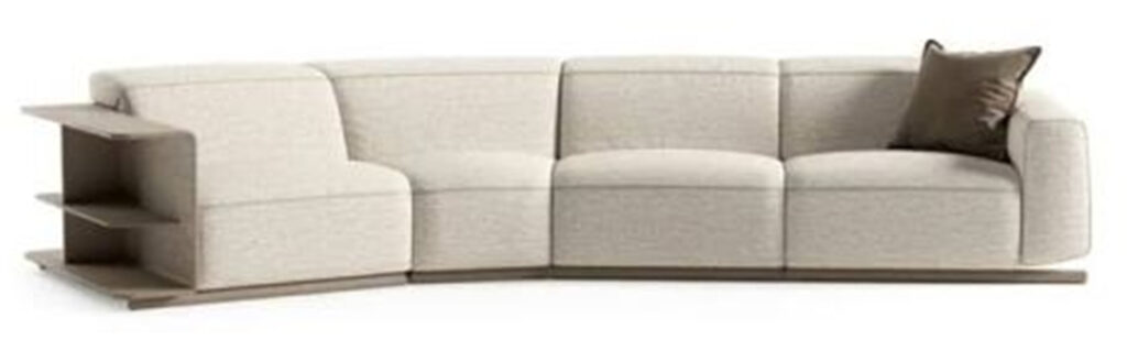 Com um design que prioriza linhas limpas e formas simples, o estofado se encaixa perfeitamente em qualquer ambiente, seja residencial ou corporativo. A modularidade do produto é outro destaque: suas diversas opções de configuração permitem criar composições personalizadas, adaptando-se às necessidades e ao estilo de cada espaço. Além disso, a integração de um sistema de console e mesa diretamente no design do sofá agrega ainda mais funcionalidade e harmonia visual. Os pés em formato sinuoso completam a atmosfera elegante e orgânica da peça.