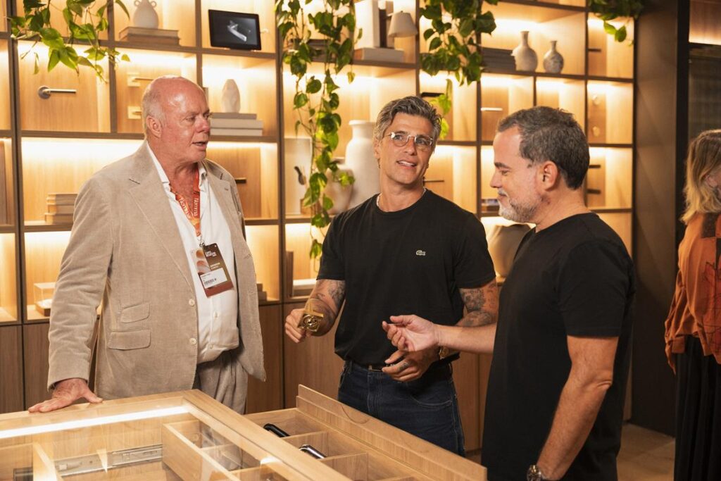 Durante a visita à feira, aproveitou o encontro com a equipe da Nomma para escolher as maçanetas e detalhes que farão parte da nova casa no rancho, mantendo o olhar atento às tendências e novidades do design contemporâneo.