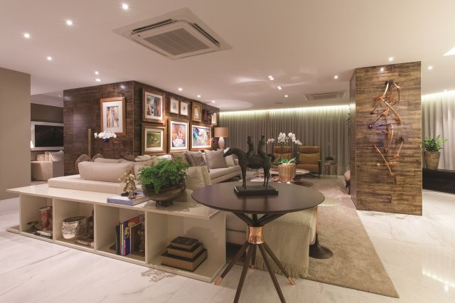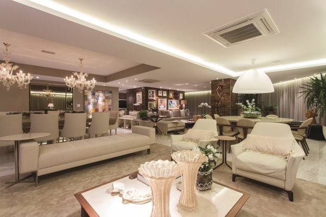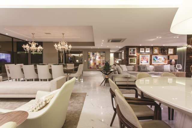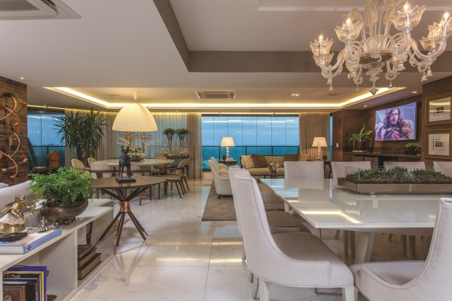 A partir do perfil refinado e hospitaleiro do casal, o arquiteto criou um apartamento integrado. A sala de jantar ampla é a porta de entrada para que se possa admirar cada detalhe da decoração. O living, criado com móveis de linhas retas, foi pensado para resultar na fusão entre a neutralidade e modernidade das peças. A porta pivotante, em espelho bronze, abre caminho para contemplar um lustre com oito lâmpadas na cor transparente, com corrente e acabamentos em metal banhado a ouro.