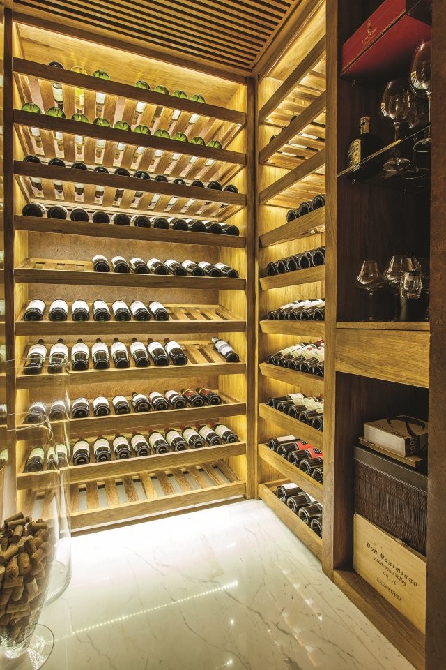 A adega foi uma solicitação dos clientes, grandes apreciadores de vinhos. Toda revestida em parede de cortiça, o espaço é um dos pontos altos do projeto.
