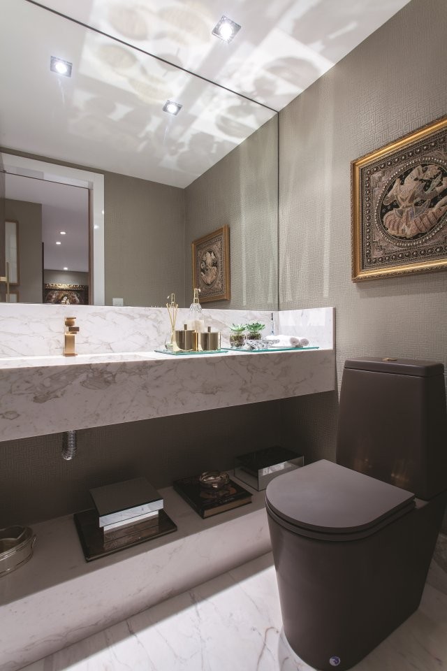 Como extensão da área social e disfarçado pelo painel de madeira, o lavabo traz sofisticação com tons sóbrios na composição de cores chocolate e dourado. Destaca-se a obra de arte do acervo pessoal do cliente valorizada por uma iluminação cênica e pontual, com rasgos de luz, que criam uma luminosidade geral, difusa e aconchegante. Ao longo dos cômodos é possível se encantar com uma vasta coleção de obras que vão de Calazans Neto a Carybé, passando por Floriano Teixeira e Mário Cravo Jr.