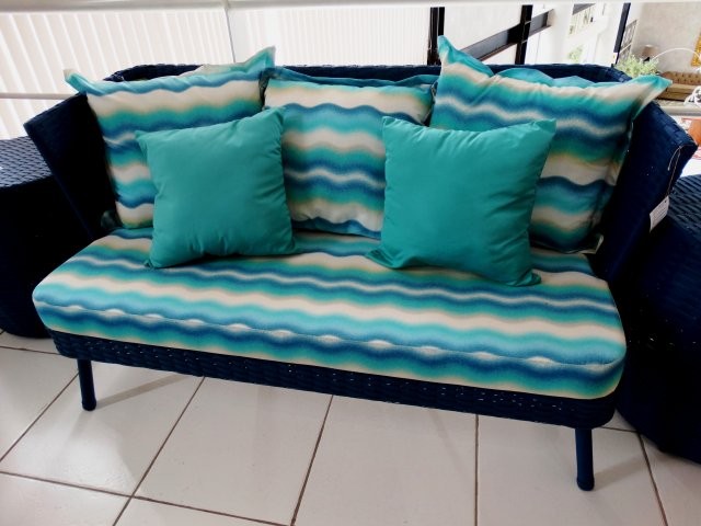 Para completar o aconchego da casa, a Modalle Móveis criou o sofá Fiori. Feito em fibras e estrutura em tubos de alumínio, é o toque descontraído para varandas, espaços gourmets e qualquer outro que se queira incrementar com o estilo azul da cor do mar.