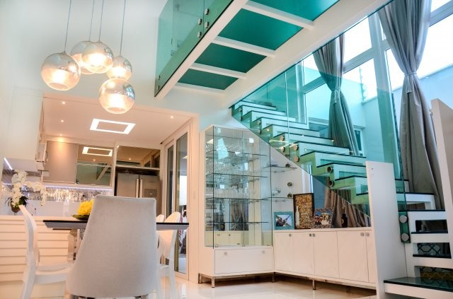 Desenhada pela designer, a escada que dá acesso à área intima da casa possui estrutura em aço e guarda corpo e degraus em vidro verde. O espaço abaixo da escada foi usado para uso de uma cristaleira toda em vidro fechado e armários de madeira para guardar louças e objetos funcionais, que também foram desenhados pela designer. “A Cristaleira abre com sistema de toque, sendo de fácil acesso para os proprietários e visitantes utilizarem os cristais”, comenta Renata.