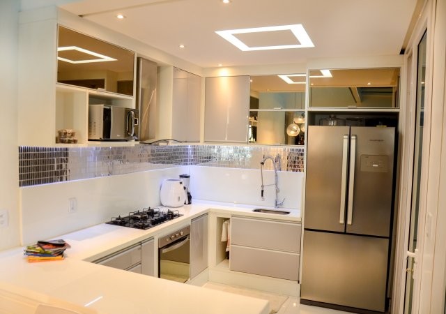 Para dar luminosidade à bancada, foram colocadas fi tas de led abaixo dos armários, resultando num ambiente contemporâneo, claro, ideal para cozinhar e interagir com visitantes e familiares. Para trazer a sensação de amplitude, a cozinha conta com armários em tons neutros, com portas espelhadas e pastilha espelhada acima do rodopia. Além disso, a cliente queria um ambiente claro, onde pudesse ver tudo que estava na cozinha sem sentir o ambiente poluído. Para isso, a designer utilizou o marmoglass branco na bancada e na rodopia, que traz sensação de clareza e amplitude, facilitando a visualização do manuseio de qualquer tipo de alimento.