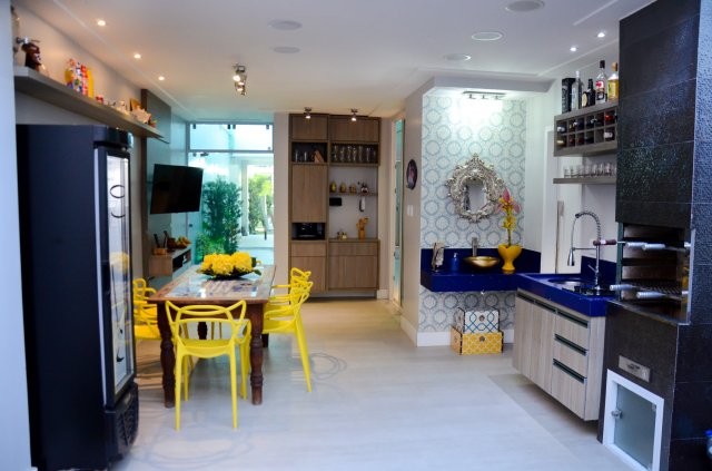 Na área gourmet, por ser um espaço eclético, foi colocado mesa em estilo rústico, com cadeiras amarelas que dão um tom de alegria ao recinto. “A utilização da cor quente amarela com o tom frio do azul proporciona harmonia ao ambiente”, explica, ressaltando que foi realizado um projeto de sonorização para causar sensações de aconchego a esse ambiente.