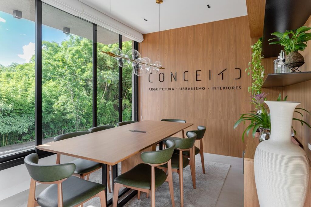 A sala de reunião ampla evidencia a força do projeto executivo e do mobiliário personalizado. O espaço conta com painel de madeira na parede, mesa para oito lugares e cadeiras com detalhes em couro verde, trazendo personalidade ao ambiente. A parede revestida com marcenaria integra múltiplos compartimentos de forma discreta e funcional, garantindo organização eficiente sem comprometer a estética do ambiente.