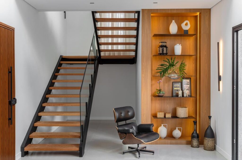 Nas áreas de circulação, como a parede ao lado da escada, as prateleiras com iluminação integrada transformam um espaço de passagem em um ponto de destaque visual, reforçando a integração entre arquitetura e design de interiores.