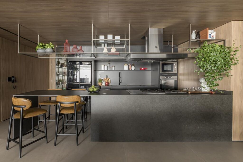 Na cozinha, a decoração aparece acima da bancada, com objetos selecionados e um paisagismo discreto que traz frescor ao espaço. A composição complementa os acabamentos e reforça a integração entre funcionalidade e estética.