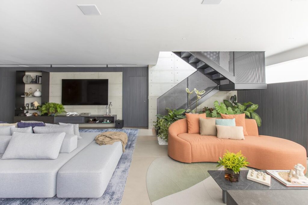 A delimitação dos espaços foi pensada de forma sutil e eficiente. Um tapete de grande dimensão marca a área da sala de estar, enquanto um modelo menor acompanha o sofá curvo no living, reforçando a sensação de acolhimento e organização visual.