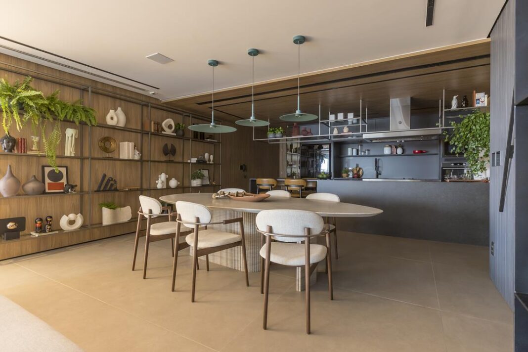 Os elementos decorativos foram essenciais para construir a narrativa do projeto. Na sala de jantar integrada à cozinha, uma estante suspensa se destaca como ponto focal. O móvel exibe vasos, esculturas e porta-retratos que remetem à atmosfera de uma galeria de arte, mas com equilíbrio e refinamento. A curadoria cuidadosa da Mais Led garante harmonia entre formas, texturas e proporções, valorizando o ambiente sem excessos.