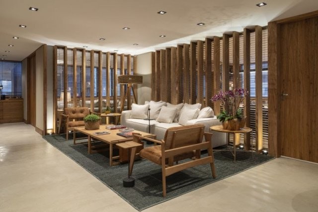 Para o projeto, o designer Felipe de Almeida optou pelo uso predominante da madeira natural, com o desejo de extrair tudo o que o material carrega: a elegância, o belo, a cor, o veio, o cheiro e o sentimento de naturalidade, para que a sofisticação e a comodidade funcionassem juntos.