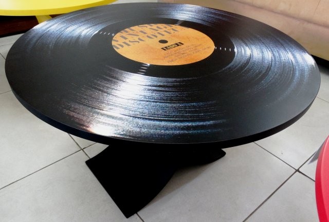 A mesa de centro com tampo inspirado em discos de vinil dá um toque decorativo ideal para ambientes despojados ou clássicos