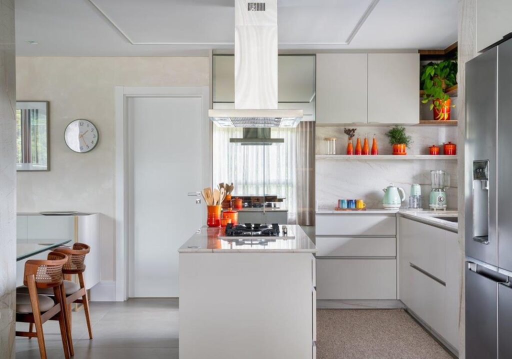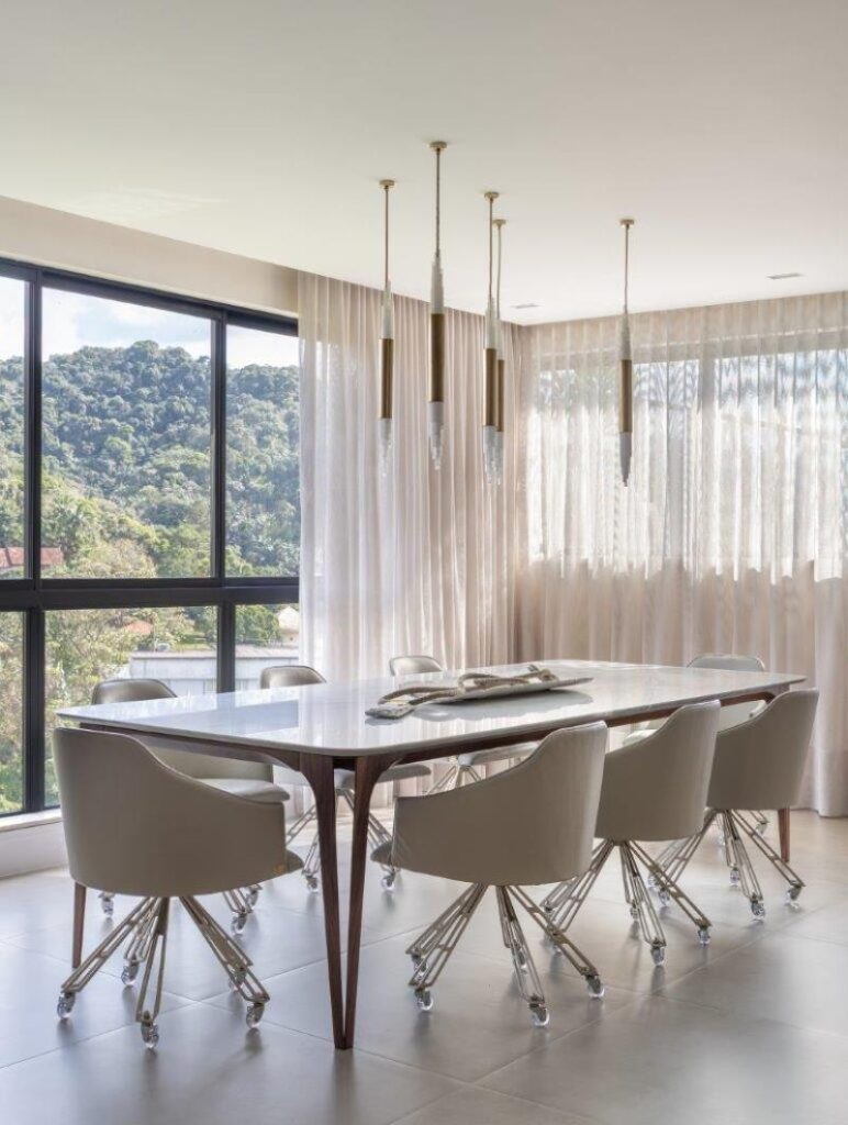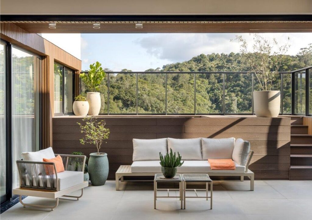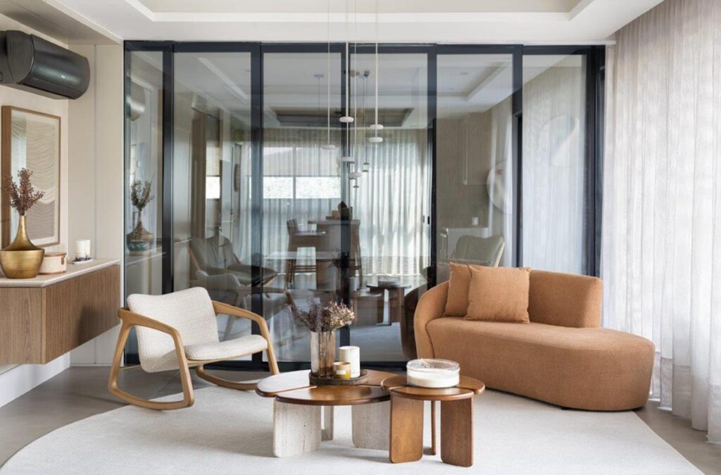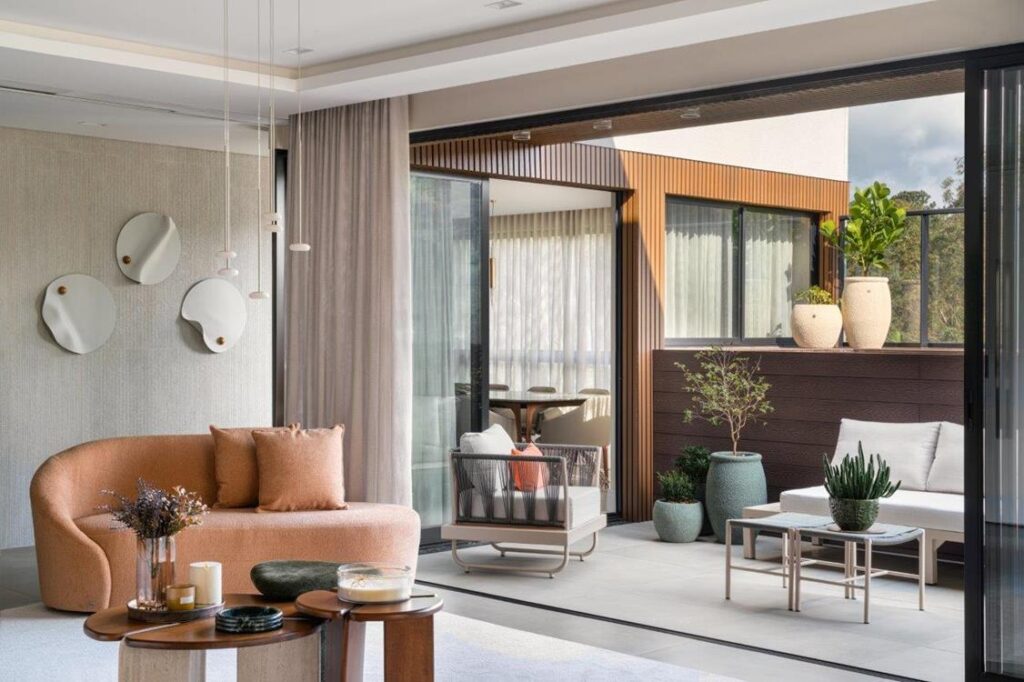 As portas de correr desempenham papel fundamental nessa integração, permitindo que o terraço se incorpore ao interior sempre que desejado, ampliando a área social e favorecendo momentos de convivência e recepção. Materiais e acabamentos foram utilizados como elementos de conexão visual, garantindo uma sensação real de integração entre todos os ambientes.