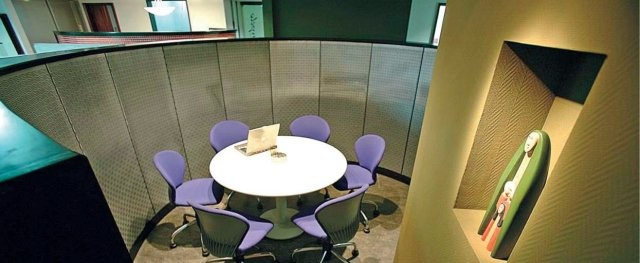 É preciso citar um uso inusitado de materiais acústicos – os móveis. O mobiliário acústico é moderno, criativo e muito versátil, podendo ser usado em ambientes comerciais, corporativos e mesmo residenciais, com excelentes resultados, assim como as ilhas de silêncio, as tramas de feltro e os biombos absorventes. São materiais lindos.