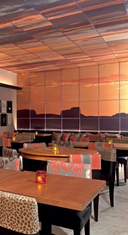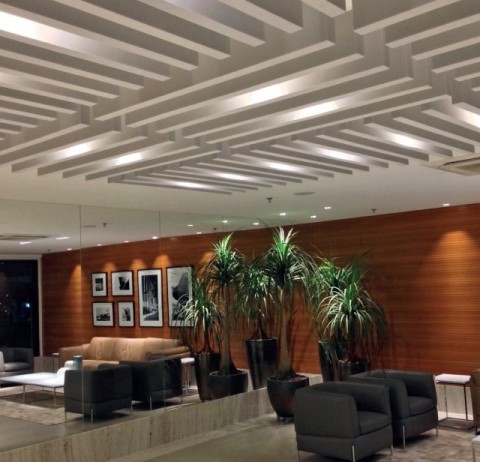 Mas hoje já temos à nossa disposição materiais alternativos, que podem ser adaptados e otimizados. Merecem destaque as muitas utilidades do gesso acartonado (que pode ser utilizado em várias cores), os forros absorventes e translúcidos (que atuam também como luminárias lindas e modernas), forros com diferentes formas geométricas, as chapas metálicas maleáveis (que possibilitam o uso em formas côncavas e convexas), as réguas de madeira, a lã de PET plotada (além da versatilidade de aplicar qualquer imagem ao material, ainda é reciclada), os quadros acústicos, as placas soltas personalizadas, os forros suspensos e as nuvens acústicas (com várias possibilidades de formatos e acabamentos). Os baffles também são uma excelente opção pela sua versatilidade e diversidade de aplicação, podendo ser paralelos, perpendiculares, iluminados, coloridos, sinuosos ou personalizados, seguindo o design apresentado pelo arquiteto ou designer de interiores.