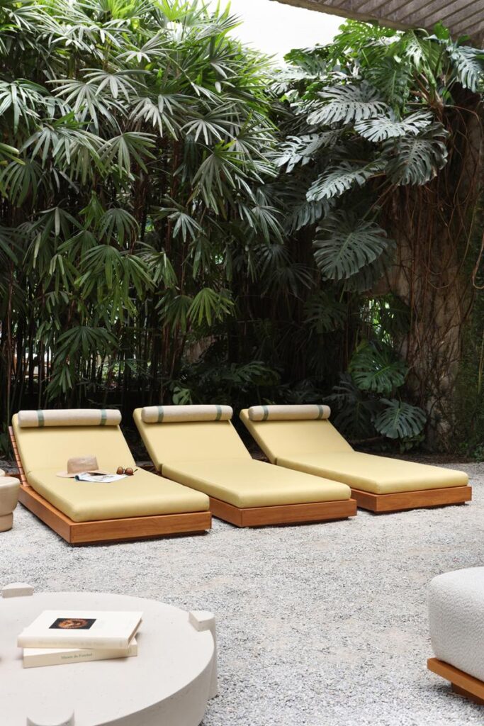 Esse imaginário se traduz em mobiliário por meio de materiais como madeira, concreto e tecidos, que convidam ao toque e ao convívio. As peças foram pensadas para levar aos espaços externos o mesmo conforto e acolhimento dos ambientes internos, criando lugares de encontro, descanso e vida compartilhada.