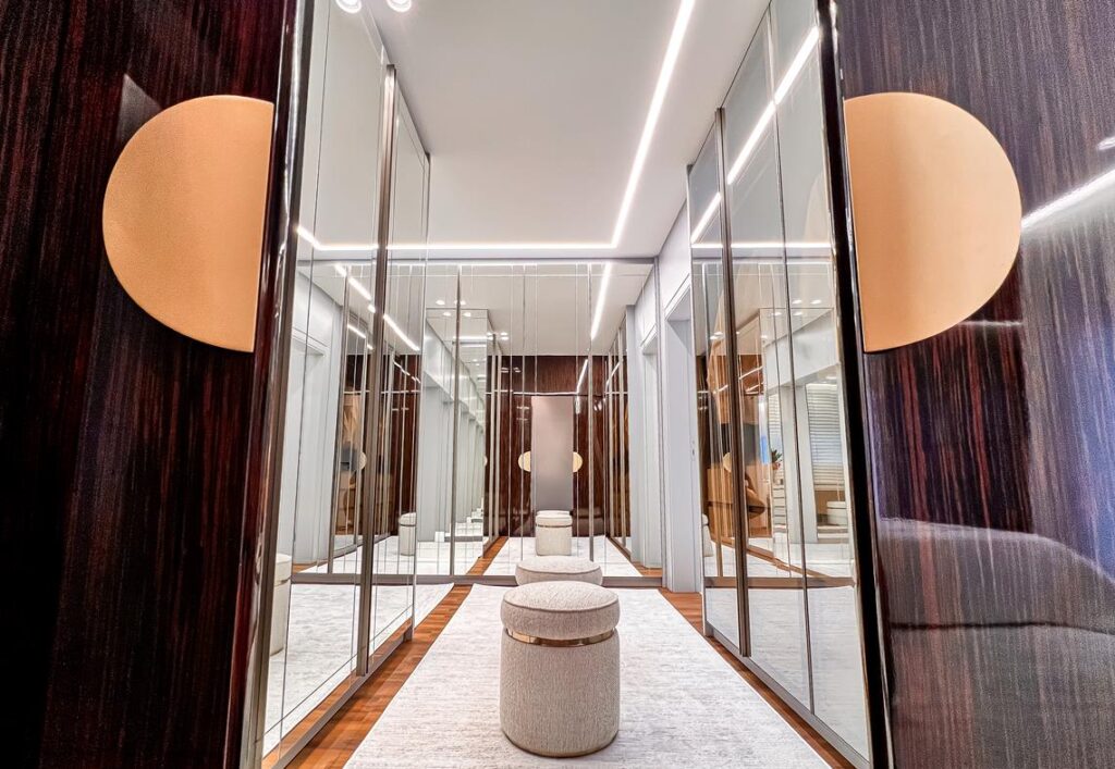 O closet virou protagonista na suíte máster de quase 38 m². Totalmente espelhado e com marcenaria planejada, o espaço de 20 m² tem dois setores e foi pensado para atender a rotina de um casal. Conta com nichos, cabideiros, gaveteiras, penteadeira, áreas de organização para acessórios, além de dois banheiros e banheira.
