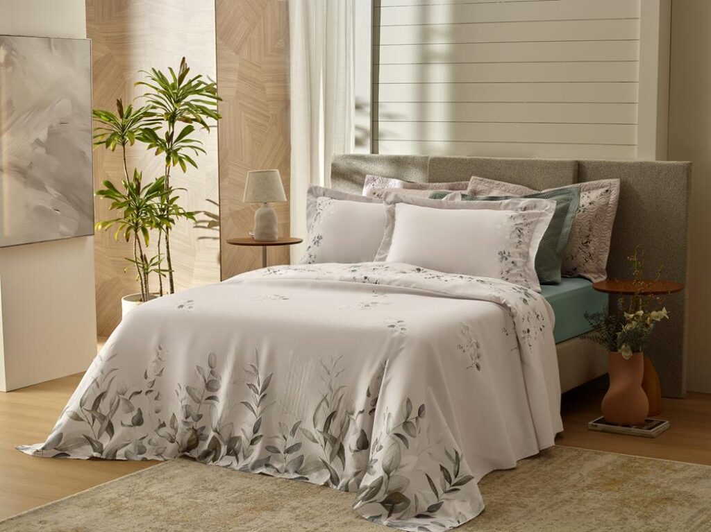 Entre os destaques está o Jogo de Cama Combinatto, que aposta na leveza e na praticidade da microfibra, aliadas a uma estampa de alta definição e acabamento com bordado nas fronhas. O resultado é um visual elegante e versátil, pensado para facilitar a composição do quarto com outros itens da mesma linha, como toalhas e cobre-leitos coordenados.