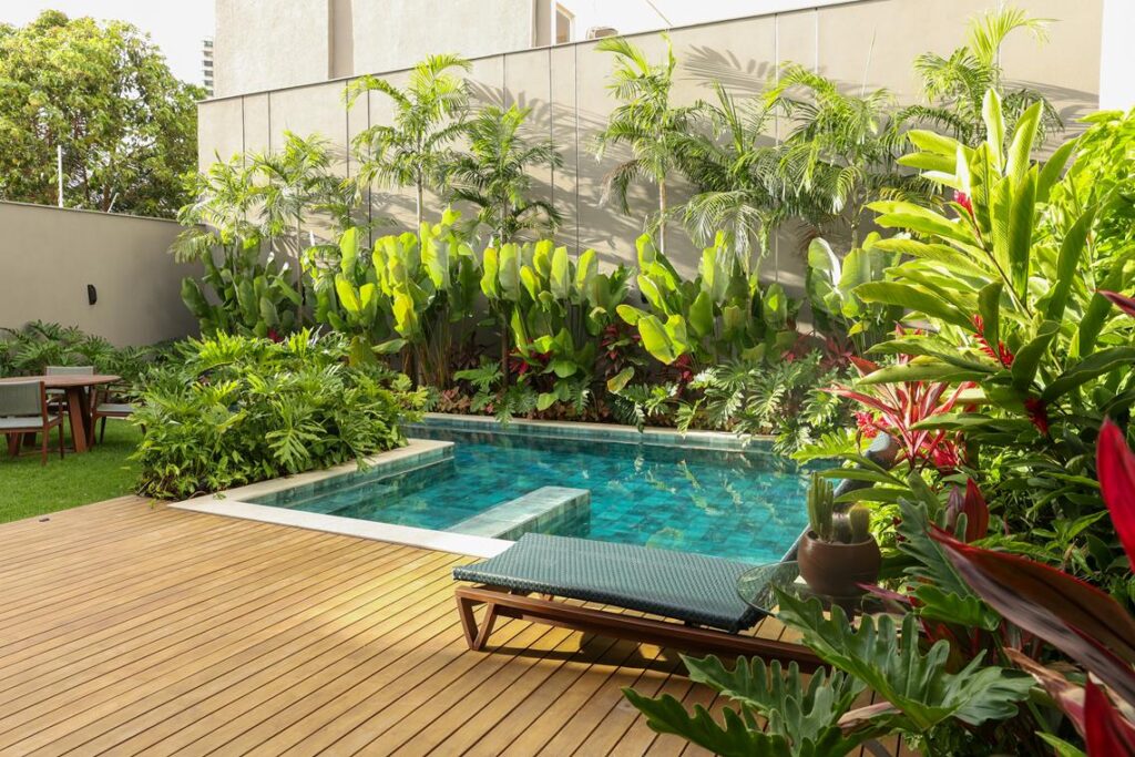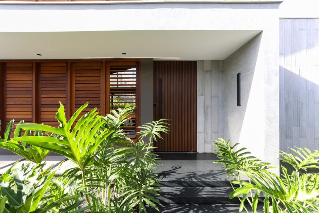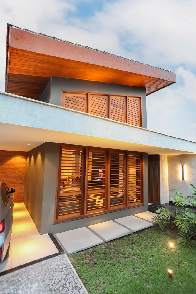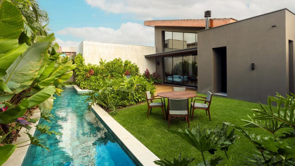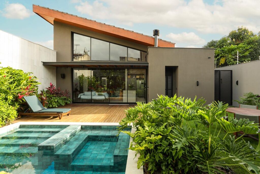 O paisagismo tropical envolve a residência, define limites, cria filtros visuais e mantém relação constante com os ambientes internos. A iluminação pontual marca volumes e caminhos, reforçando o uso da casa ao entardecer e durante a noite.