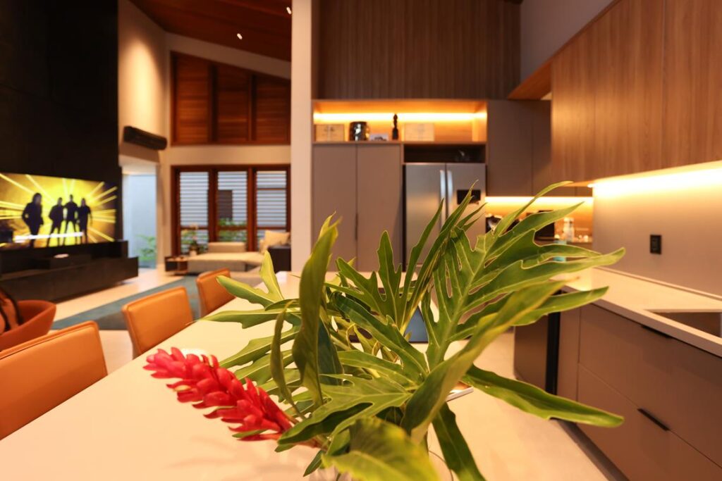 A residência é organizada em dois setores: o núcleo social e a ala íntima. O primeiro reúne sala de estar, jantar e cozinha em um único ambiente. Grandes aberturas de vidro permitem a conexão direta com o deck de madeira e com a piscina aquecida, que se posiciona de forma visível a partir dos principais espaços de convivência.