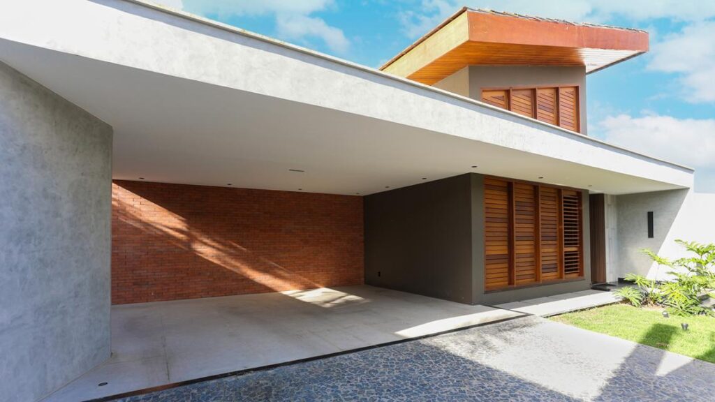 O ambiente funcional da casa inclui garagem coberta, área de serviço, depósito, quarto de apoio e casa de máquinas. Todos são distribuídos de forma a garantir o suporte às atividades da residência sem interferir no funcionamento dos espaços principais.