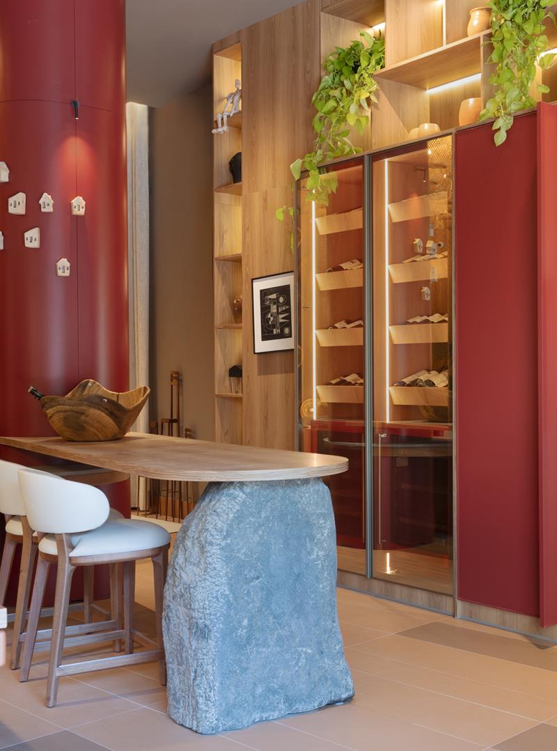 Com quase duas décadas de experiência profissional, a arquiteta Joria Guerreiro destaca-se pelo detalhismo que imprime em seus trabalhos – especialista em gerenciamento de projetos e gestão de negócios, ela aplica essa visão estratégica ao Café IJP, espaço projetado especialmente para a Mostra Manaus. Inspirado na beleza cotidiana do ato de cozinhar e receber, Joria utiliza contrastes marcantes entre o clássico e o contemporâneo, manifestados pelo uso do concreto e da delicada marcenaria clara. O mobiliário Artefacto, em especial a caixa-bar Pietra, contribui diretamente para materializar essa visão, adicionando sofisticação e funcionalidade ao ambiente. A iluminação inteligente e a composição cuidadosa dos elementos criam um espaço acolhedor, refletindo a filosofia arquitetural-emocional de Joria.