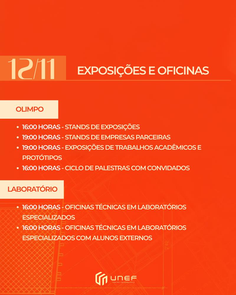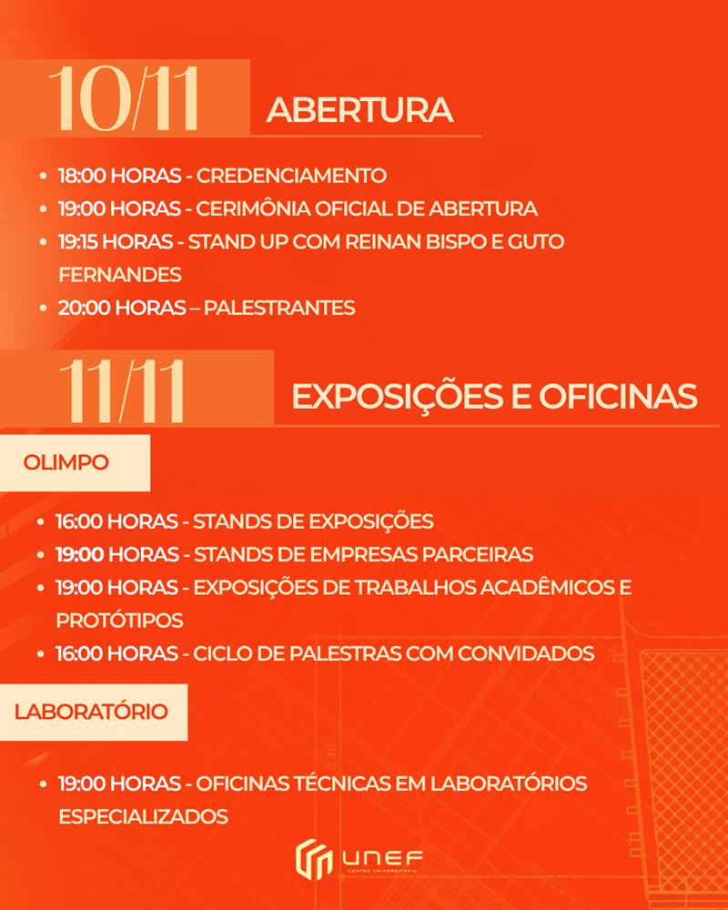 Nos dias 11 e 12 de novembro, o evento contará com exposições de trabalhos acadêmicos e protótipos, stands de empresas parceiras, oficinas técnicas e ciclos de palestras com convidados. As atividades acontecerão nos espaços Olimpo e Laboratórios UNEF, promovendo o diálogo entre o ambiente universitário e o mercado profissional.