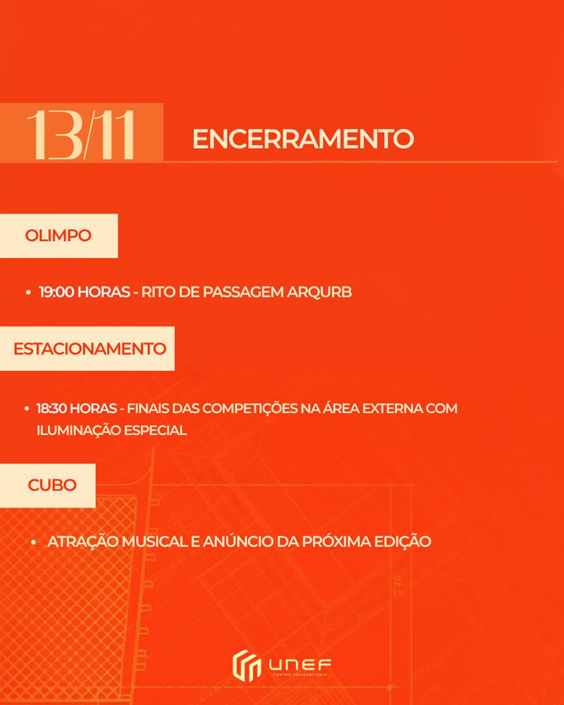 O evento se encerra no dia 13 de novembro, com o rito de passagem ARQURB, as finais das competições e uma atração musical, marcando o anúncio da próxima edição.