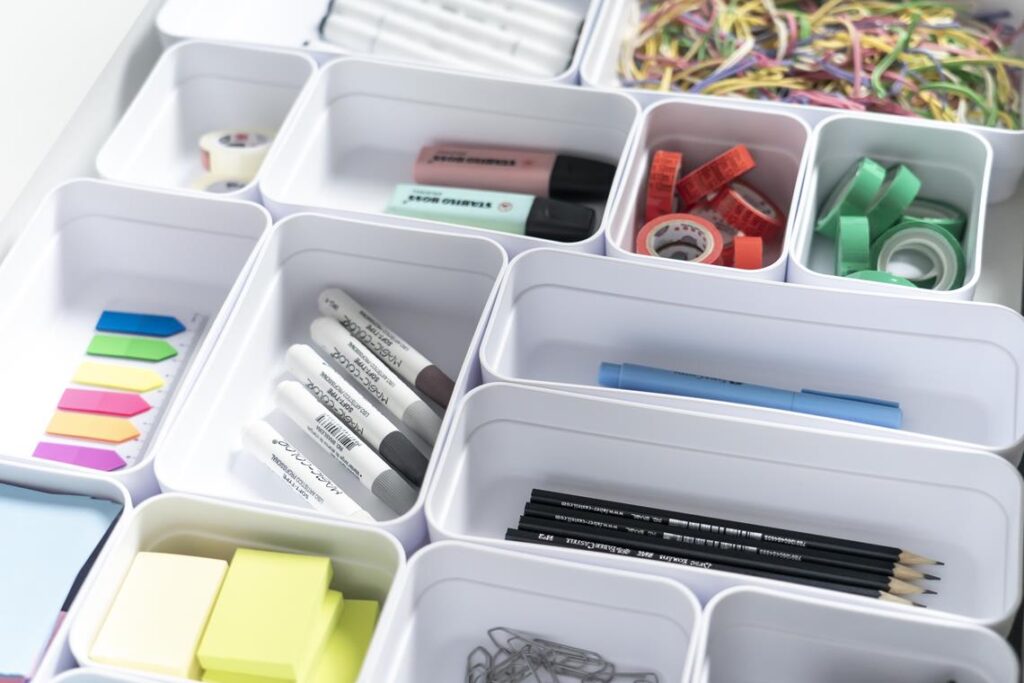 Gavetas com colmeias e caixas organizadoras ajudam a manter o visual limpo e facilitam a manutenção da ordem. “Organizadores modulares e da mesma cor, como os da linha Logic, da Ou, não só facilitam a organização e visualização de itens pequenos, como são ótimos para todos os tipos e tamanhos de gavetas, possibilitando montar as divisões de acordo com a necessidade do estudante”, exemplifica Josi.