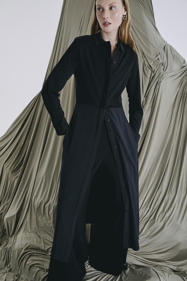 Uma coleção feminina e masculina, ageless, formas statement do outerwear. Parkas, camisas como jacket, vestidos que podem funcionar como túnica ou veste, top em gola alta, calça ampla de alfaiataria, “tudo para ser usado oversized”, é uma maneira de ser”, define Gloria Coelho.