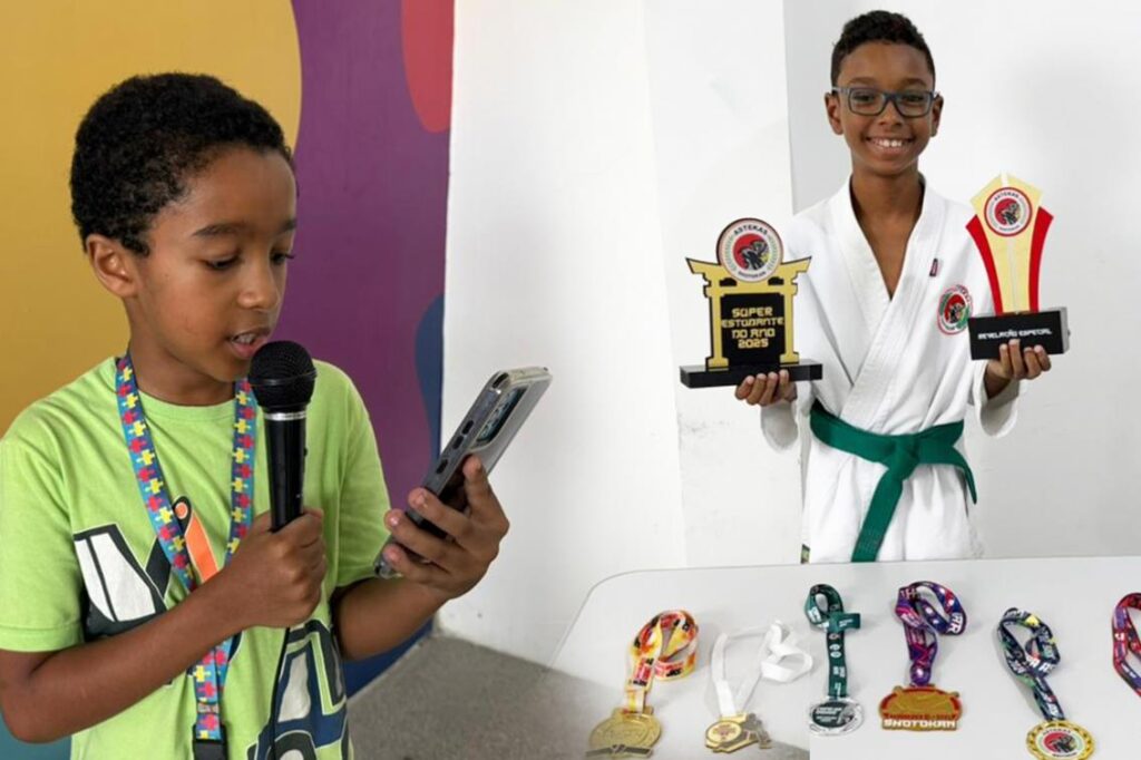 Já Kennedy Lopes Rodrigues Maia, de 11 anos, luta karatê há dois anos, é faixa verde e campeão brasileiro e baiano da modalidade. “Comecei a lutar karatê, parei, mas voltei com toda a minha potência, pois sou apaixonado por esse esporte. Os katas de que mais gosto são o Jion e o Heian Godan. O karatê ajudou no meu desenvolvimento, socialização, concentração e aprendizado. Aprendi com meu professor que não posso bater em alguém, mas, se alguém vier me agredir, posso me defender. Sou campeão baiano e brasileiro de karatê e trouxe esses títulos para minha cidade, Feira de Santana. Vou disputar o mundial de karatê no estado do Espírito Santo”, expressou Kennedy.