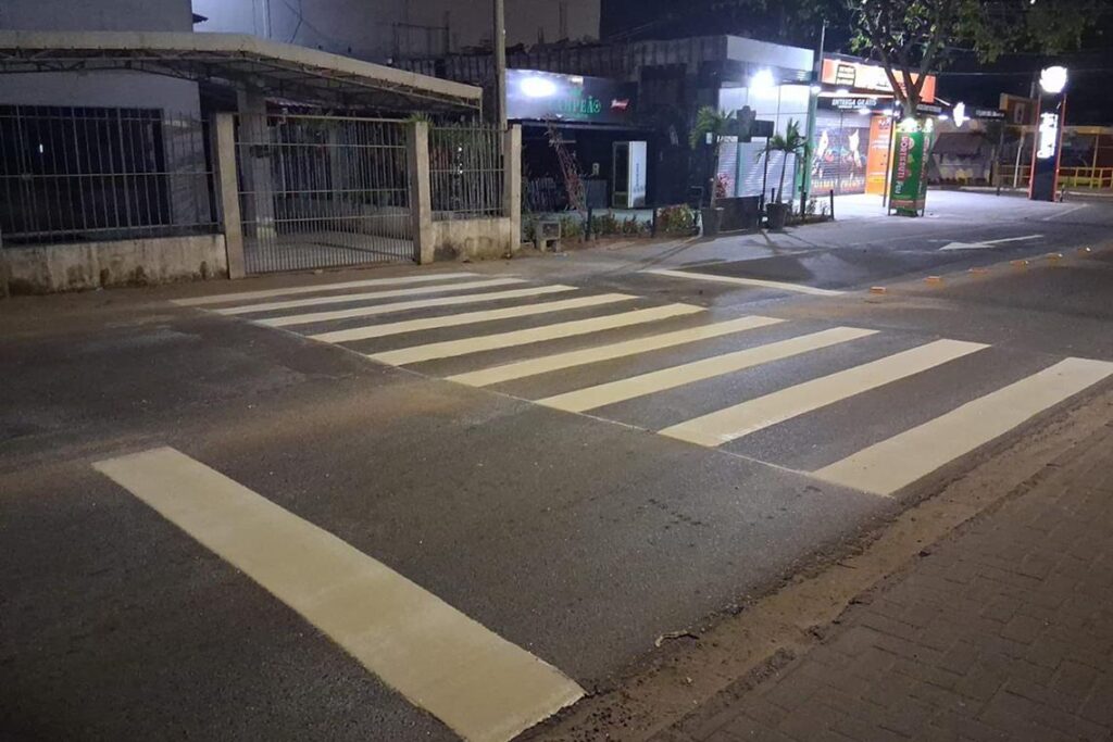 Na rua Artêmia Pires, está sendo realizada a pintura de faixa de pedestres em extrudado e a pintura de seta em extrudado.