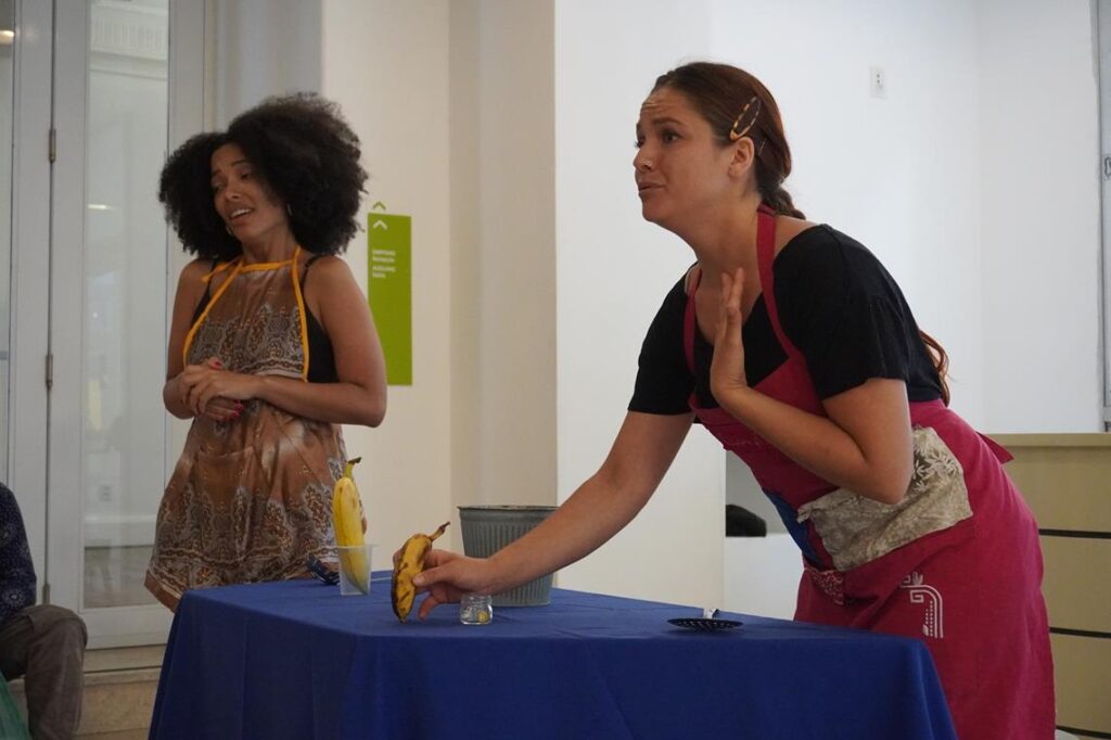 Voltada a estudantes, professores e escolas de teatro, a atividade apresentou duas cenas que mesclam humor, crítica e poesia para discutir os impactos da indústria alimentícia sobre o meio ambiente e as práticas agrícolas tradicionais. Em uma delas, a artista usa o exemplo simbólico da banana — que, no Canadá, se restringe à variedade prata por questões de exportação e conservação química — para questionar os limites da produção industrial e da manipulação genética dos alimentos. Na outra, reflete sobre a cadeia do cacau e suas conexões com processos de grilagem e exploração de terras. As apresentações foram seguidas de um bate-papo com o público, estimulando a troca de percepções e o diálogo sobre as contradições entre consumo, cultura e sustentabilidade.