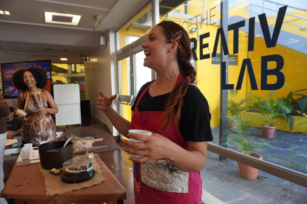 Nesta semana, o Goethe-Institut Salvador recebeu o ensaio aberto da atriz canadense Camille Benville, a Mila, residente da Vila Sul. A especialista em teatro de objetos apresentou trechos do espetáculo “Fofocas Comestíveis”, uma criação que propõe um olhar crítico e poético sobre a indústria alimentícia e os desafios contemporâneos da alimentação.