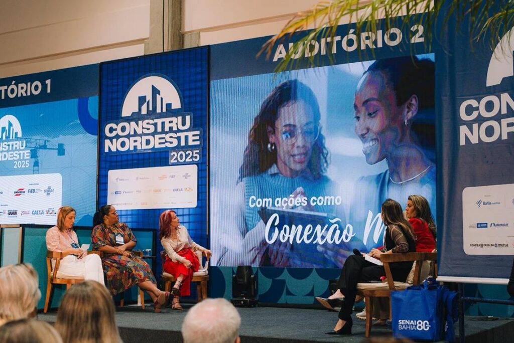 Mediado por Arlene Vilpert, vice-presidente do Comitê da Cadeia Produtiva da Construção Civil, o talk show reuniu nomes como Ana Cláudia Gomes Martins (CBIC), Fernanda Lordêlo (Secretaria Municipal de Políticas para Mulheres), Renata Muller (CMI/FIEB) e Flávia Pedreira (CMI/FIEB), em uma conversa potente sobre inclusão, liderança e oportunidades para mulheres no setor.