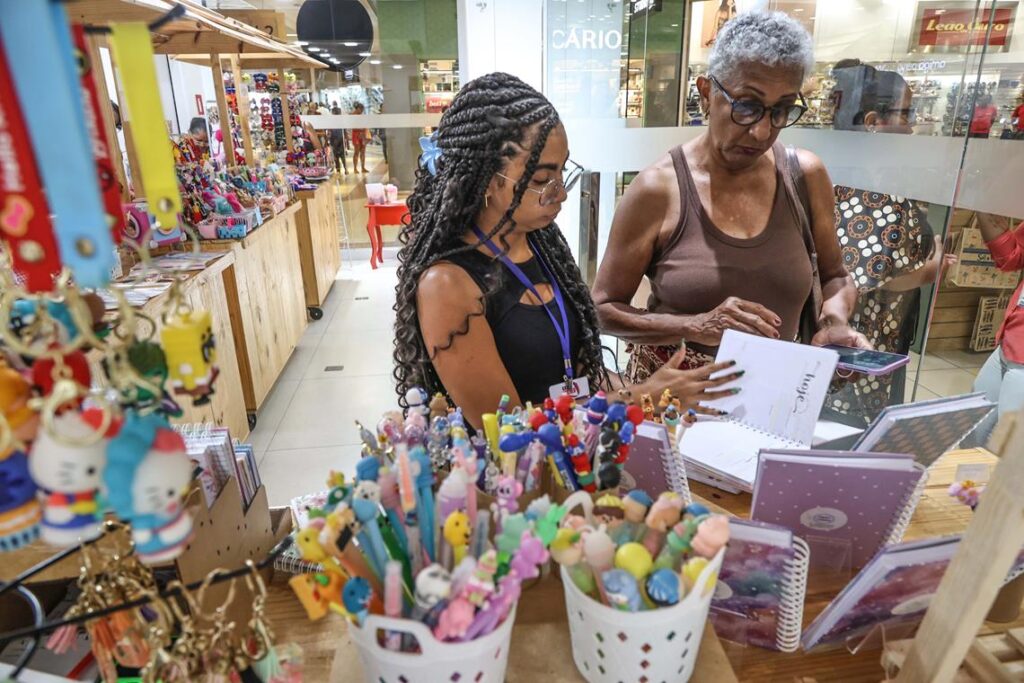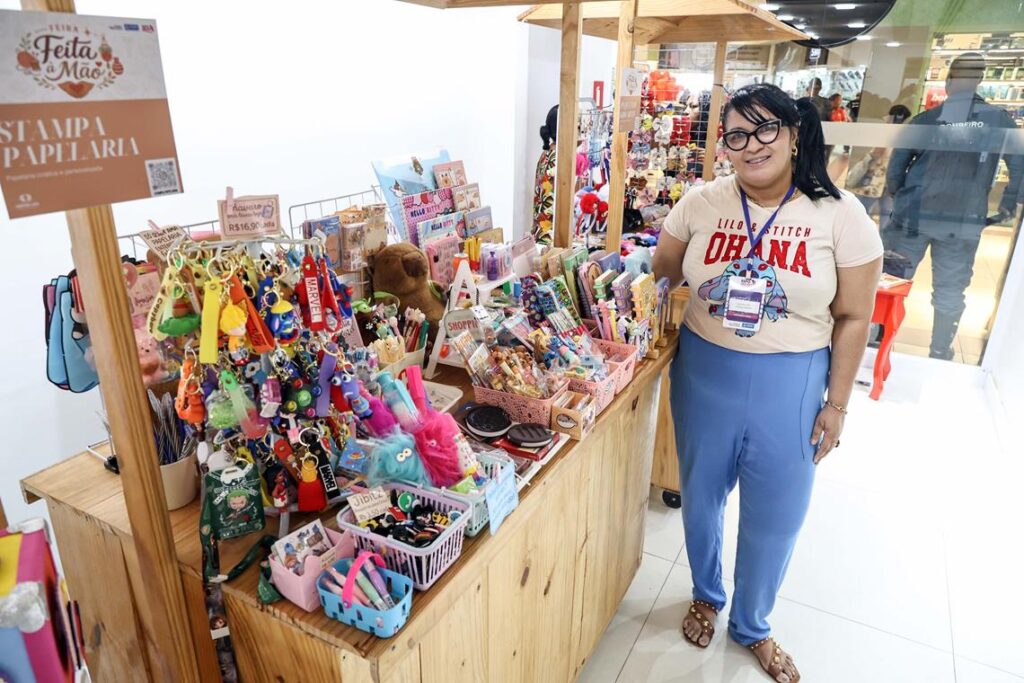 Depois de quase 20 anos trabalhando em regime CLT, Agnes Santos, 48 anos, resolveu se dedicar apenas à produção artesanal, atualmente sua única fonte de renda para sustentar a filha adolescente de 15 anos. A arte se baseia em enfeitar, personalizar e tornar únicos objetos simples de papelaria e de uso escolar, a exemplo de cadernos, canetas, estojos e mochilas. “Sempre amei papelaria, sempre fui apaixonada. Vi nesses produtos a oportunidade de transformar o básico em extraordinário, levando fofuras para as pessoas”, afirma a artesã, que já comemora o movimento de clientes na feira.