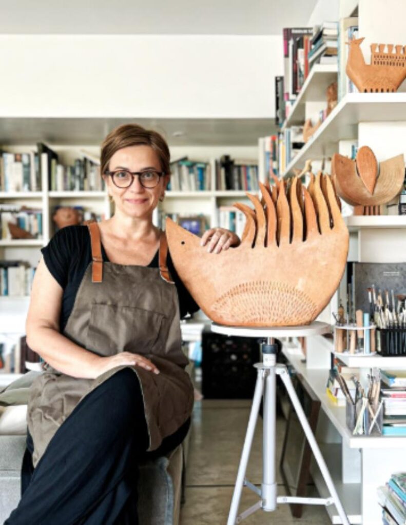 Outra participante da feira é a designer e ceramista Aline Angeli, de Alagoas. Levando peças em cerâmica de duas coleções intituladas Guardiães e Voos: a primeira inspirada na natureza e na simplicidade da região, com objetos que remetem a anfitriões silenciosos, e a segunda nas ondulações que remetem aos ventos, aos relevos que capturam movimento e falam da capacidade de transcendência por meio desenhos únicos. As peças são feitas de barro orgânico e modelados em forno artesanal a 1000 graus.