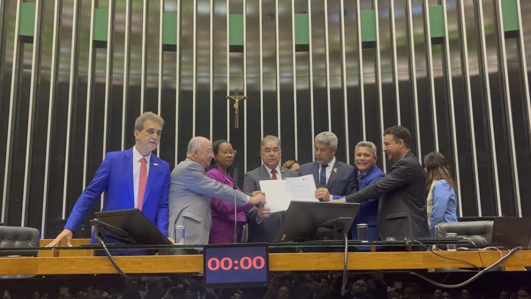 Quero dizer a alegria dessa imagem que foi registrada no plenário. Você vê deputados federais, estaduais, vereadores, prefeitos da região, religiosos, governo do estado e senadores da república, uma imagem muito típica de quem quer ajudar a construir uma democracia diferente. Você vê ali Zé Ronaldo e Zé Neto, que disputaram as eleições acirradas de 2024, juntos discutindo e construindo um ambiente favorável aos direitos de Feira de Santana. Para mim, essa imagem que fica nacionalmente.