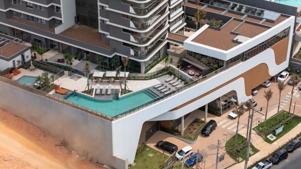 Outro destaque do projeto é a concepção das áreas comuns. Desde o início, o Neo Alphaville foi pensado para oferecer uma nova forma de vivenciar os espaços de convivência, com amenities distribuídos em um amplo podium elevado, que se estende lateralmente ao longo da torre e promove integração visual e fluidez espacial entre as áreas de lazer e o entorno do empreendimento.