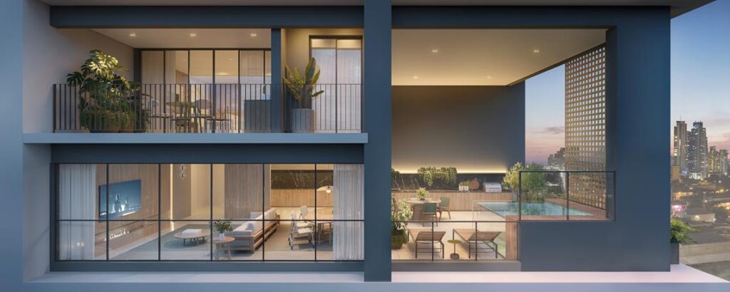 Projeto de uma torre traz unidades de 2 quartos e 3 suítes, de 71 a 129 m², e penthouses de 173 a 227 m², com pé-direito duplo nas varandas das penthouses, piscina privativa e ponto para churrasqueira a gás em todas as tipologias